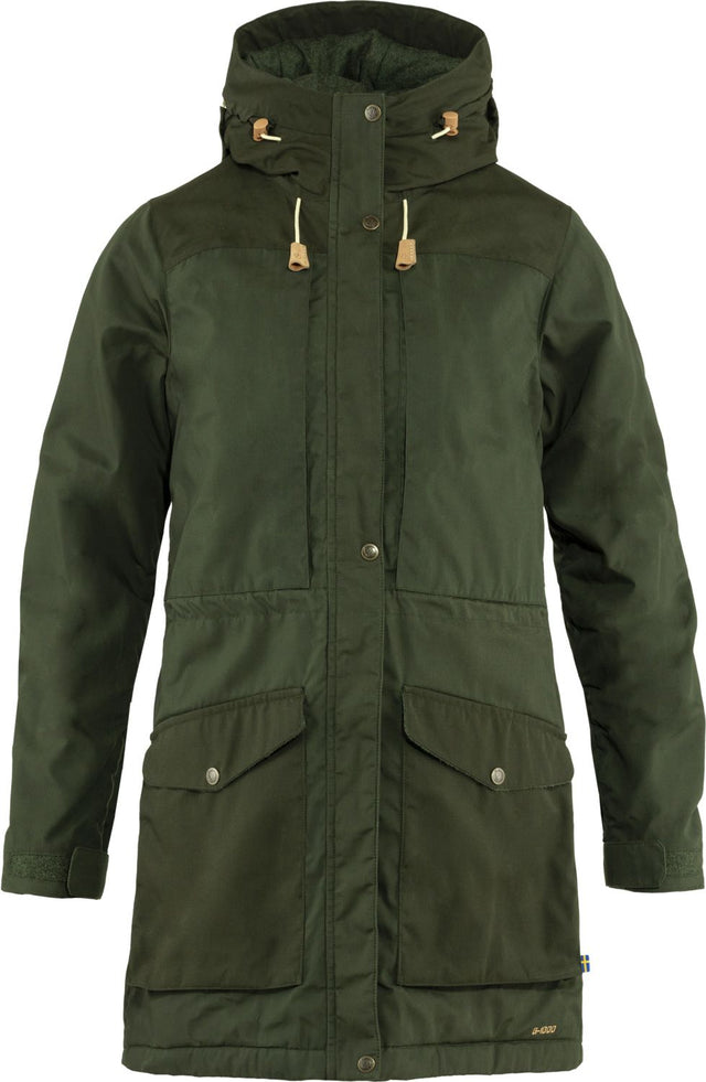 The Fjällräven women's Singi Wool Padded Parka combines tradition and innovation to provide natural, long-lasting warmth during winter. Insulated with a blend of Swedish wool and recycled synthetic fibers, it retains warmth even in wet conditions. Its G-1000® Lite Eco fabric, reinforced with G-1000® Eco, provides durability, wind resistance, and protection from light showers. It's a technical and stylish parka, ideal for both everyday life and winter outdoor activities.