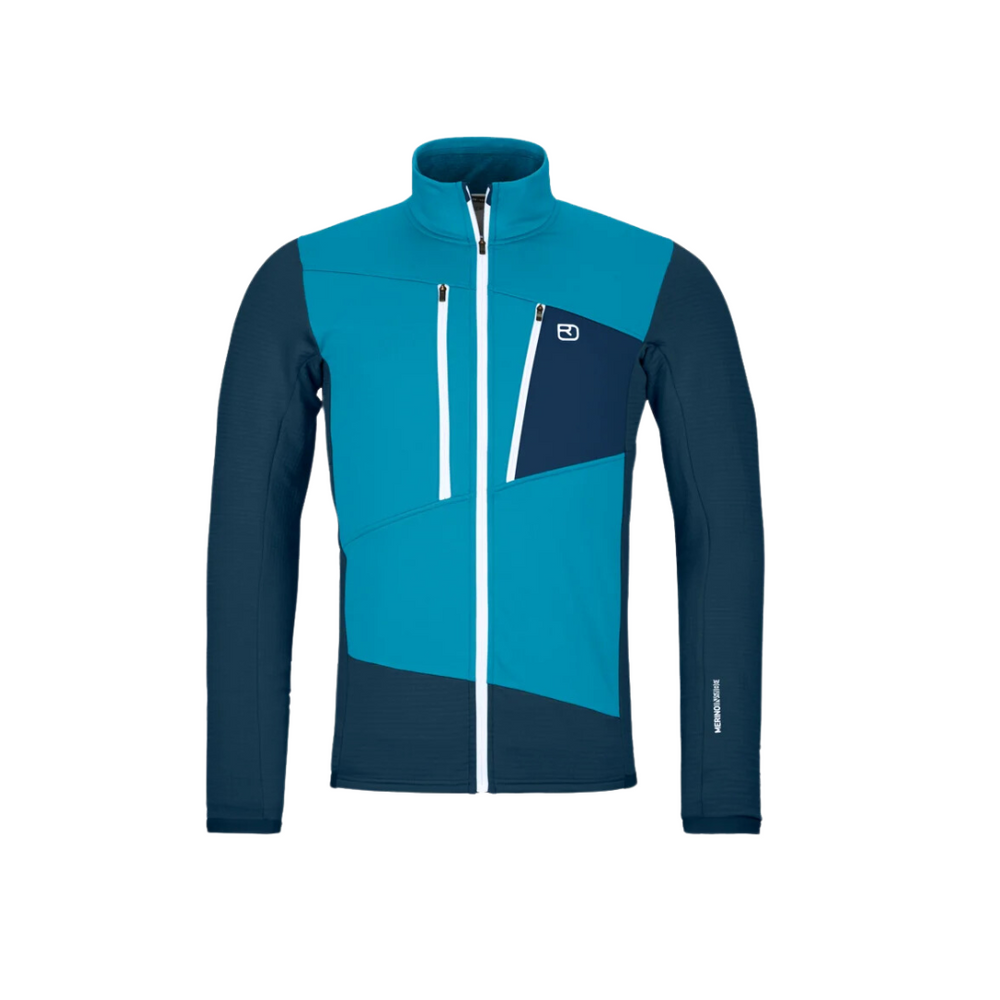 The MERINO FLEECE GRID material traps warm air in its fine waffle structure on the inside and wicks moisture away to the outside, so the jacket not only provides comfortable warmth, but also dries quickly and is extremely breathable. The pleasantly soft merino wool on your skin ensures optimal climate regulation and prevents the formation of odors. Exposed areas such as the chest, shoulders, and head are protected from wind and cold by elastic and breathable MERINO FLEECE LIGHT.