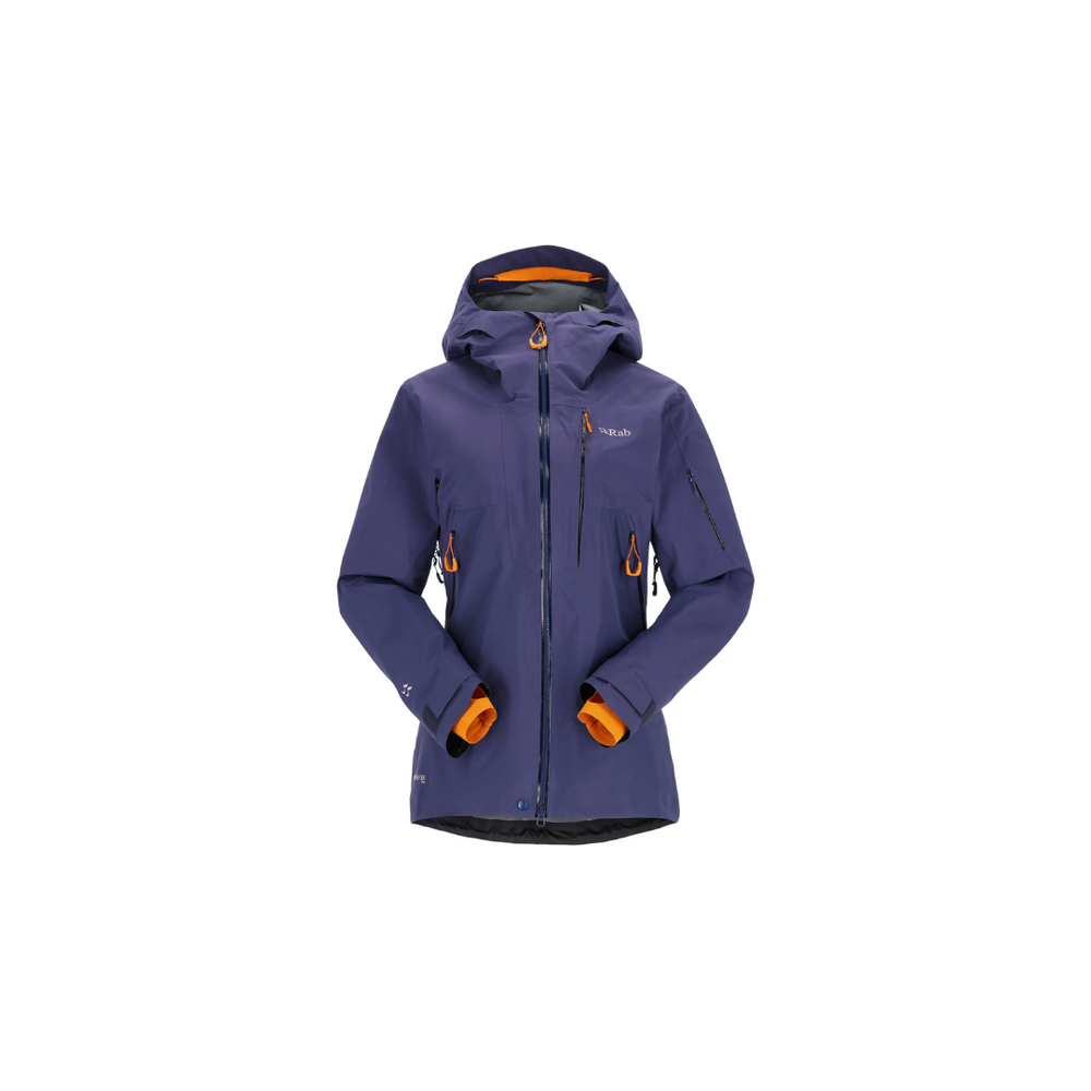 Women's GORE-TEX Pro 3-layer jacket designed for mountaineering and high-end skiing. Zoned fabric construction: longer cut for protection from powder snow, chin cord, ski-compatible hood with rigid visor and generous ventilation: ideal for tackling technical ascents and challenging descents in the mountains.